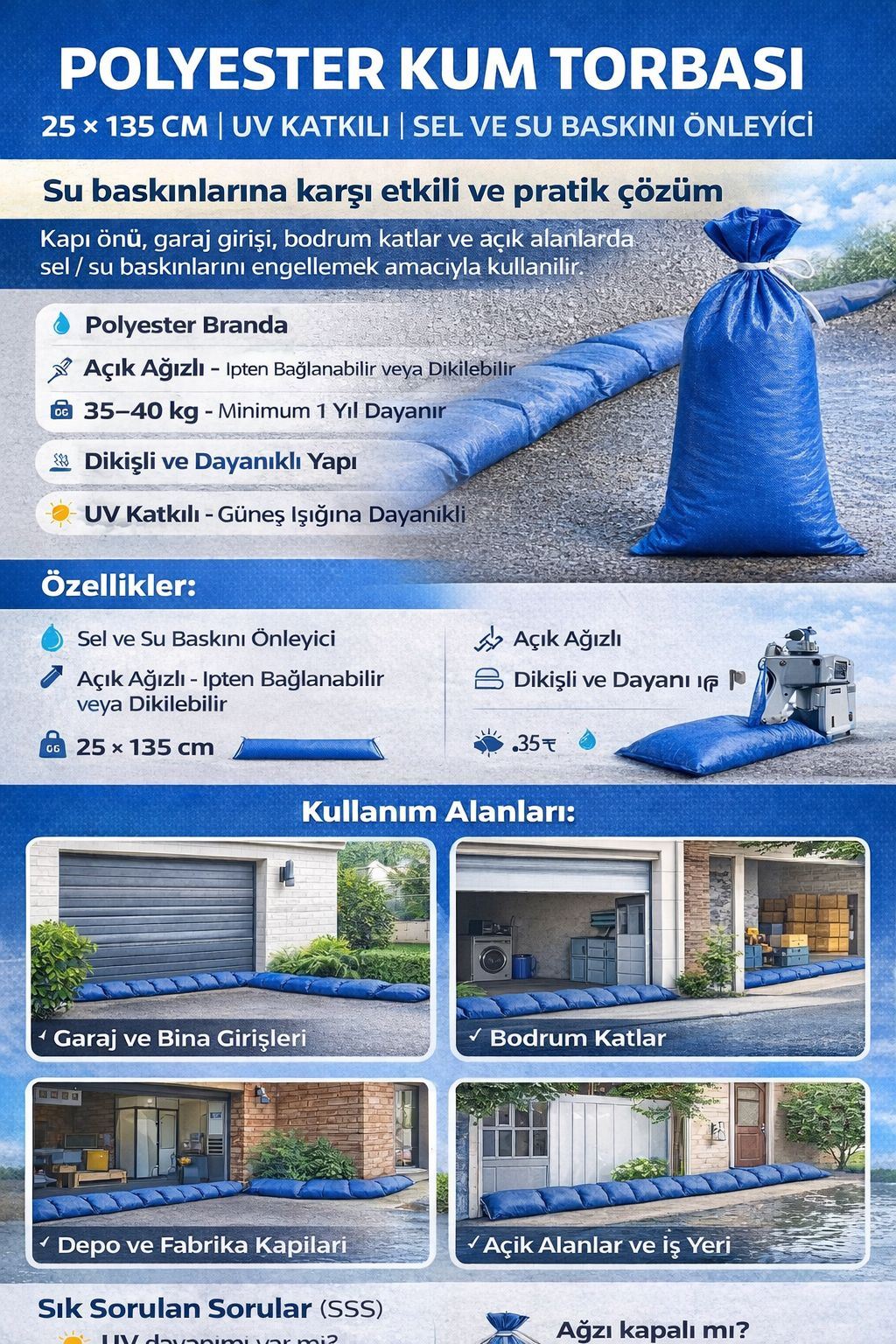 Bu polyester kum torbası, özellikle sel ve su baskınlarını engellemek amacıyla üretilmiştir. Kapı önü, garaj girişi, bodrum katlar ve açık alanlarda suyun ilerlemesini yavaşlatmak ve yönlendirmek için kullanılır.